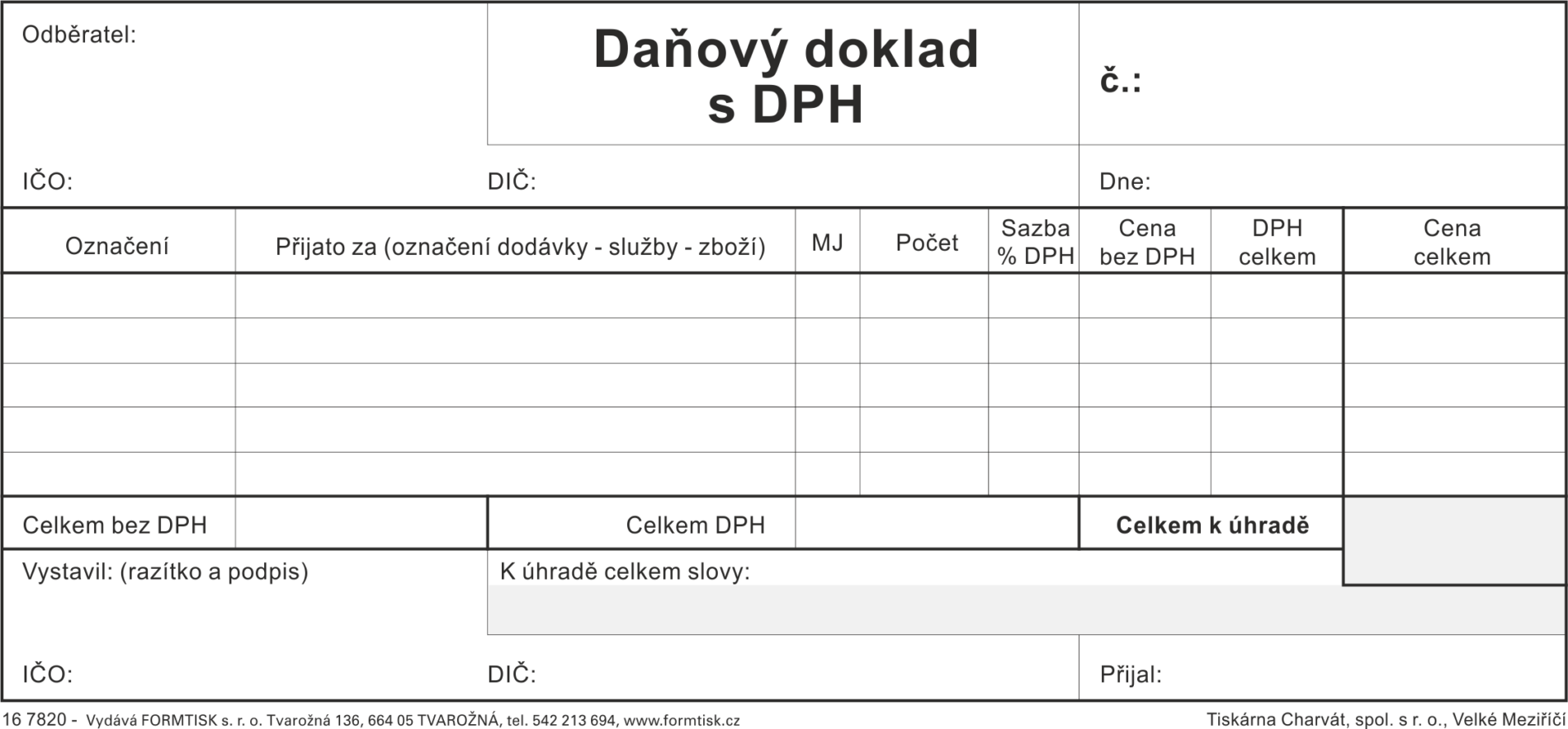 Blok formátu 1/3 A4,na šířku, samopropisovací, šítý, 100 listů. U šité hrany perforovaný pro snadné oddělení. Tisk jednostranný. Papír samopropisovací GIROFORM.